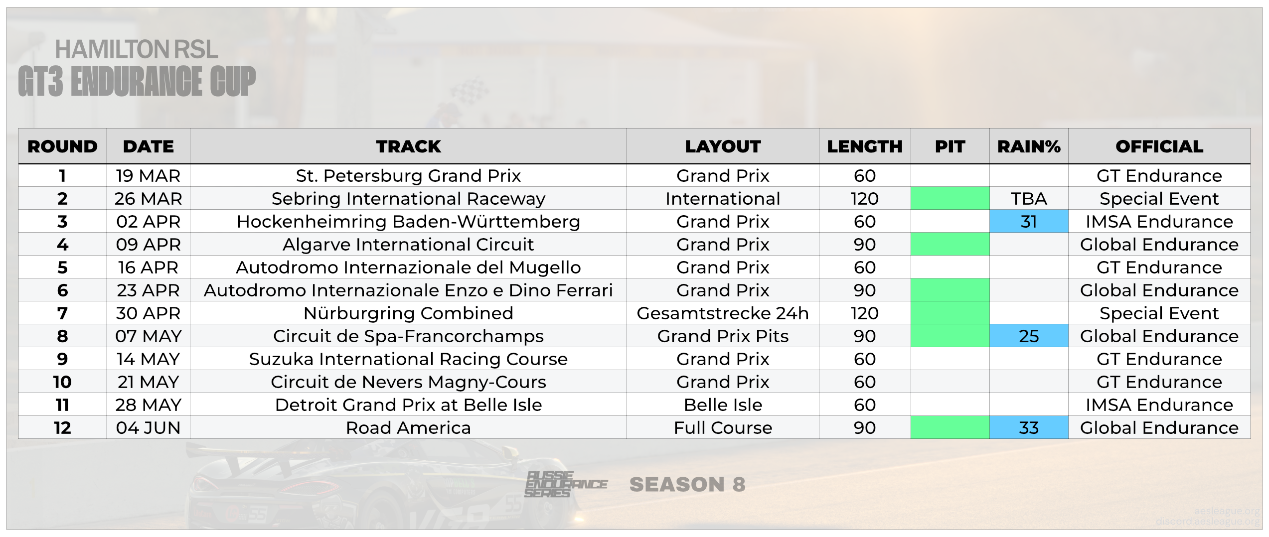 Season Schedule:R Dates Track Layout Race Length 1 19 MAR St. Petersburg Grand Prix Grand Prix 60 2 26 MAR Sebring International Raceway International 120 3 02 APR Hockenheimring Baden-Württemberg Grand Prix 60 4 09 APR Algarve International Circuit Grand Prix 90 5 16 APR Autodromo Internazionale del Mugello Grand Prix 60 6 23 APR Autodromo Internazionale Enzo e Dino Ferrari Grand Prix 90 7 30 APR Nürburgring Combined Gesamtstrecke 24h 120 8 07 MAY Circuit de Spa-Francorchamps Grand Prix Pits 90 9 14 MAY Suzuka International Racing Course Grand Prix 60 10 21 MAY Circuit de Nevers Magny-Cours Grand Prix 60 11 28 MAY Detroit Grand Prix at Belle Isle Belle Isle 60 12 04 JUN Road America Full Course 90